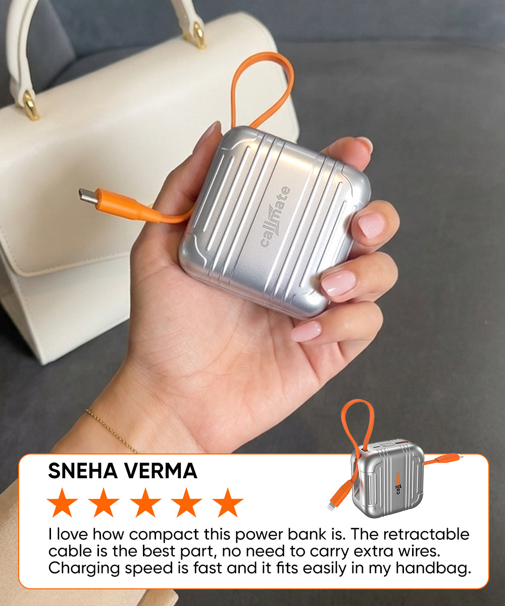 Compact and powerful power bank with fast charging and a convenient retractable cable perfect for everyday use and travel.