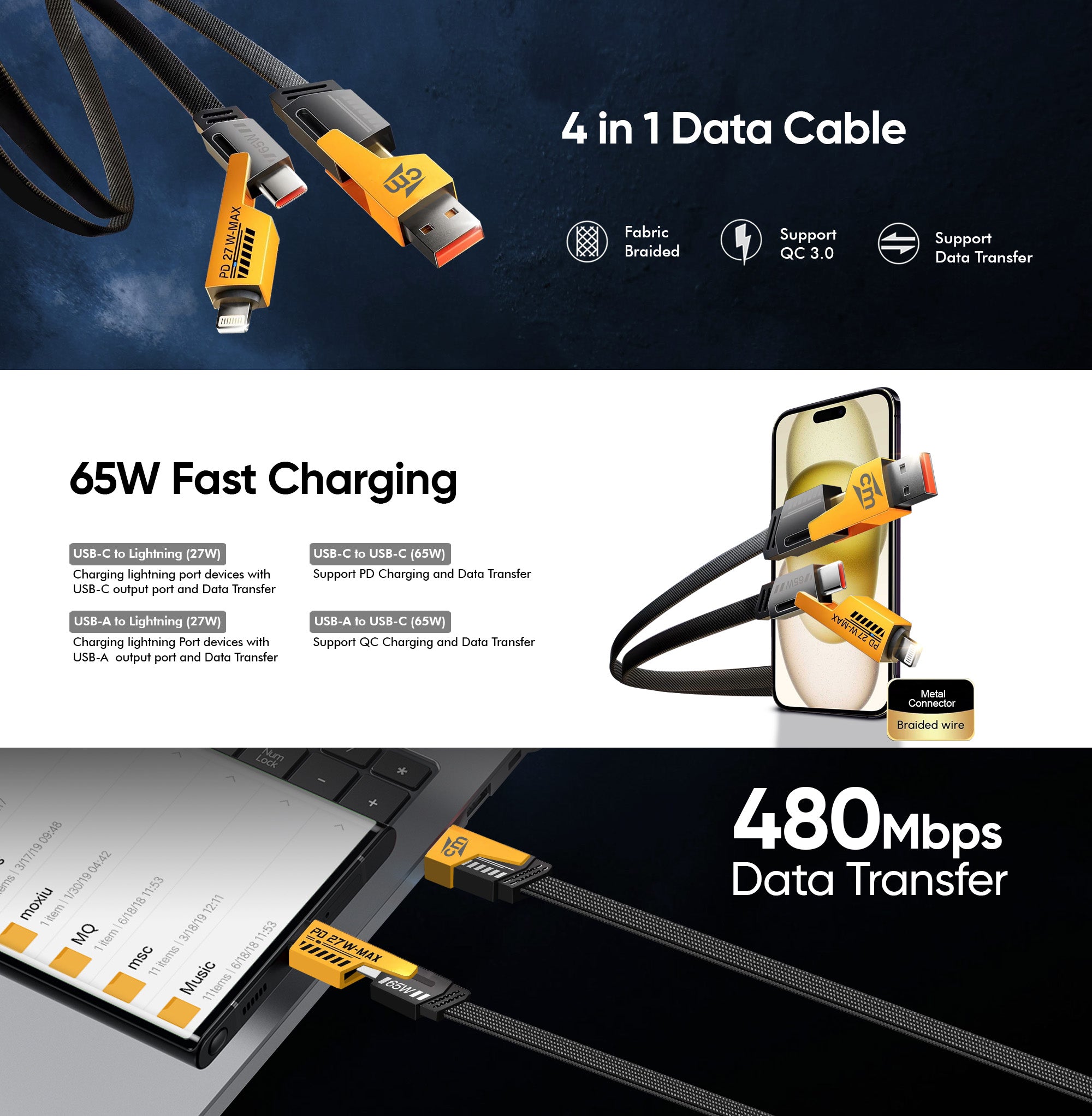 4 in 1 Multi-Device Charging Cable: Combines multiple connectors in one cable, including USB-C to USB-C (65W), USB-A to USB-C (30W), USB-C to Light-ning (27W), & USB-A to Light-ning (27W), making it compatible with a wide range of devices.