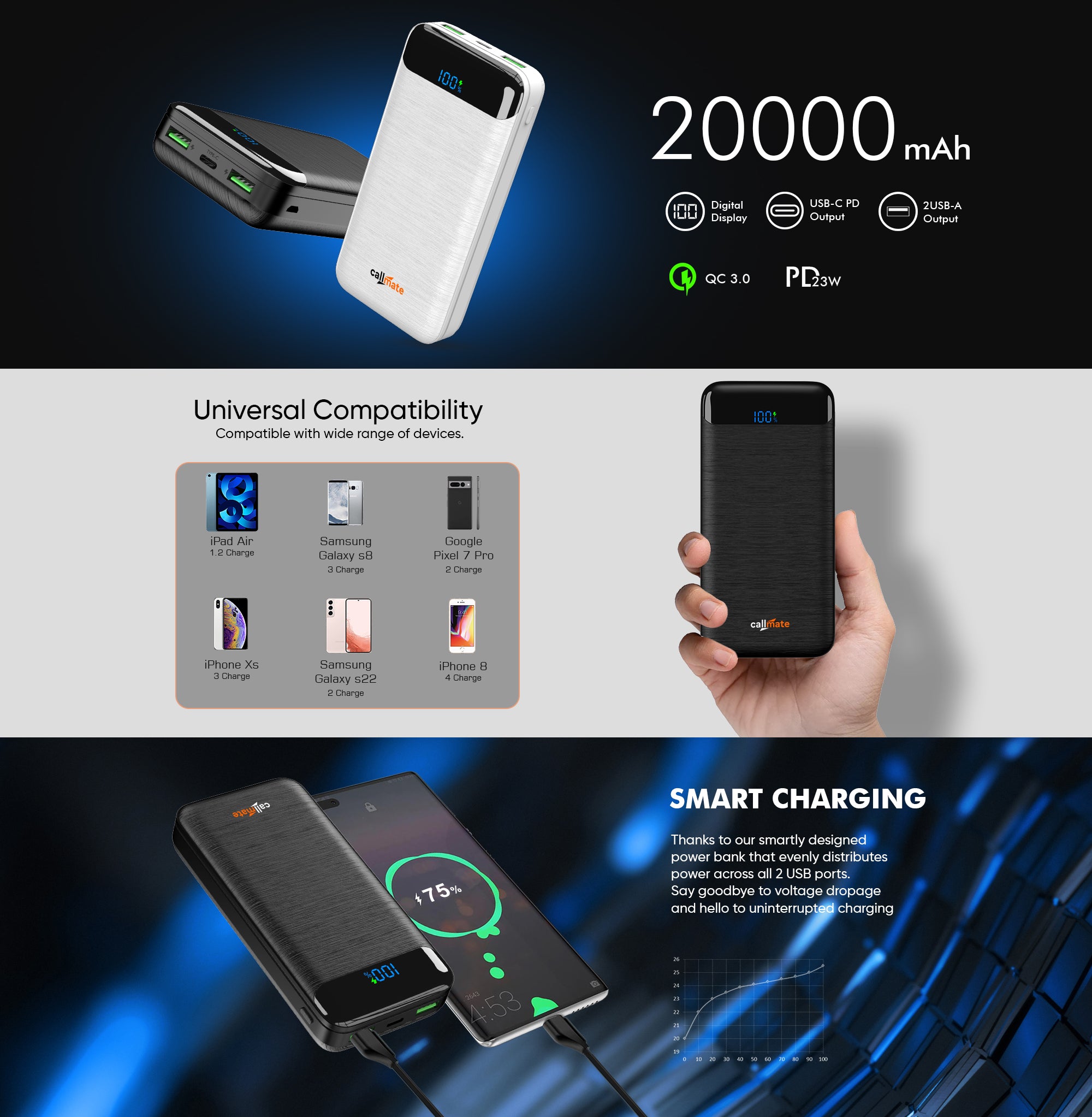 Powerful Battery Capacity: 20000mAh battery provides ample power to charge your devices multiple times.