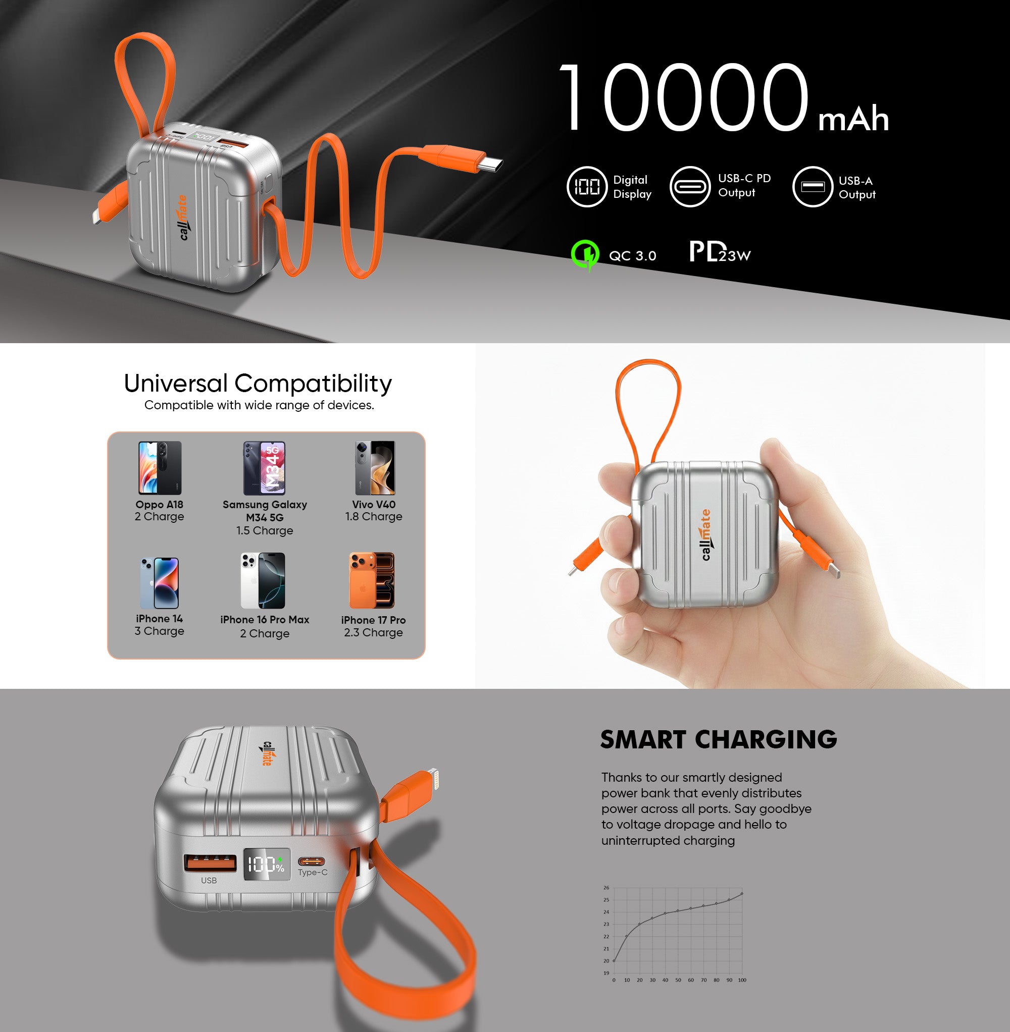 Built-in Retractable Type-C Cable (20W, 56cm): Pull out cable design keeps charging neat, tangle free, and highly portable no extra cable needed.