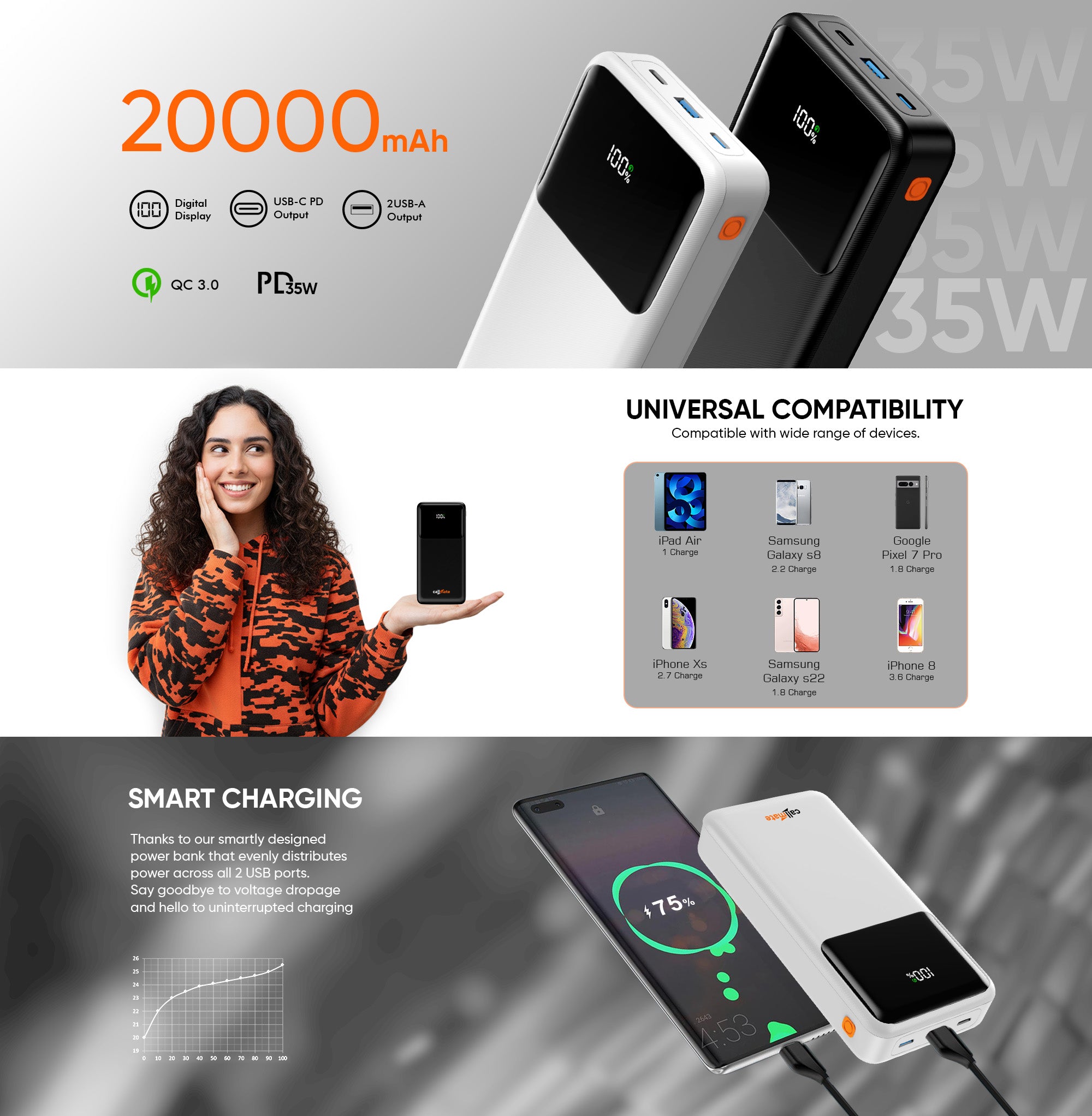 35W Super Fast PD Charging: Features 35W USB-C Power Delivery + 23W USB-A QC output for rapid, efficient charging of smartphones, tablets & more.