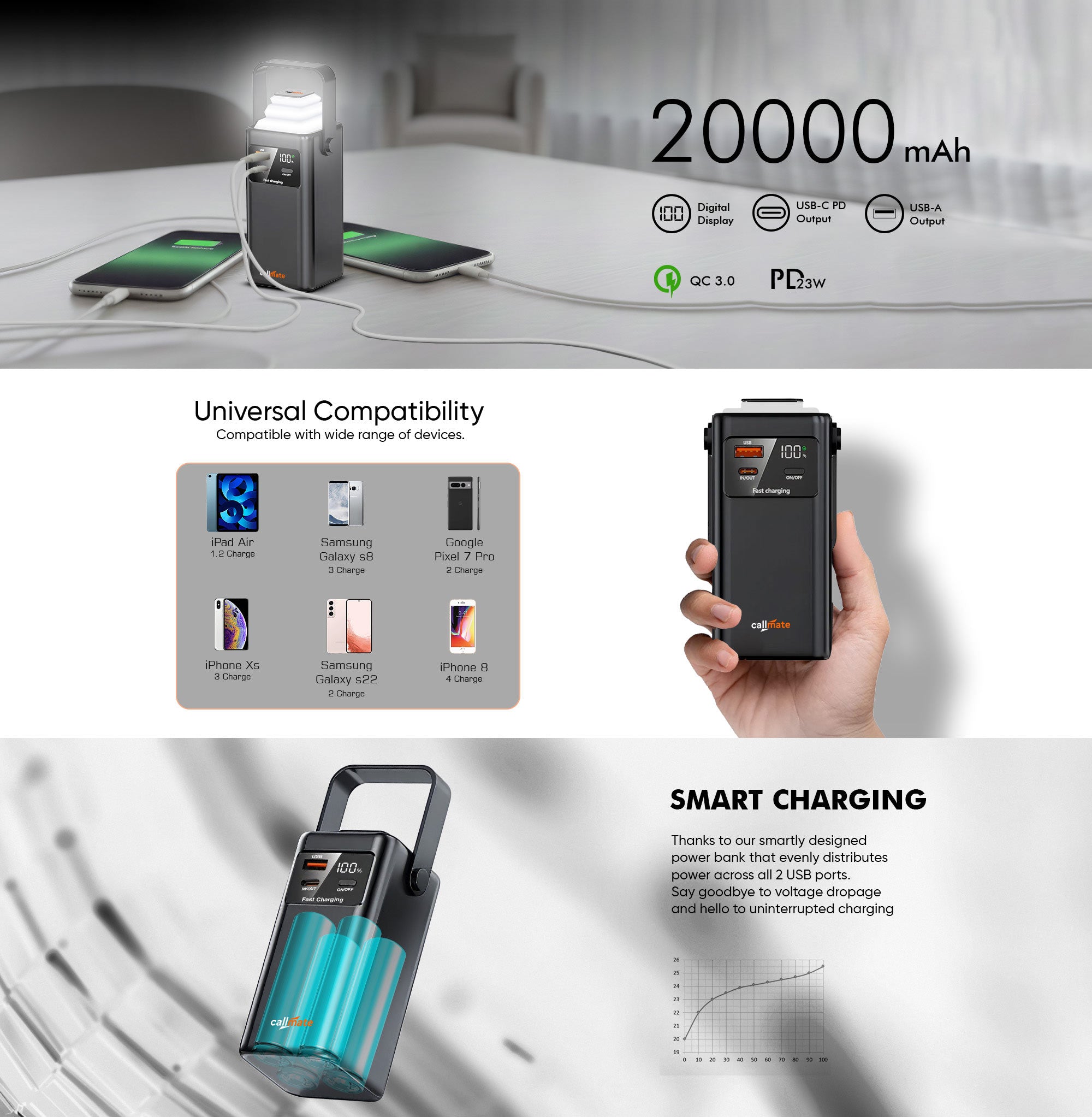 Massive 20000mAh Battery Capacity: Stay powered up for days with CALLMATE high capacity power bank, ideal for smartphones, tablets, and other USB-powered devices.